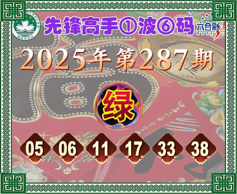 287期:【先锋高手】 ①波⑥码【绿波】开:猴34错