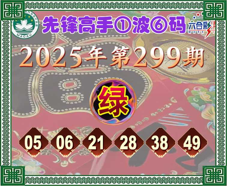 299期:【先锋高手】 ①波⑥码【绿波】开:蛇49准