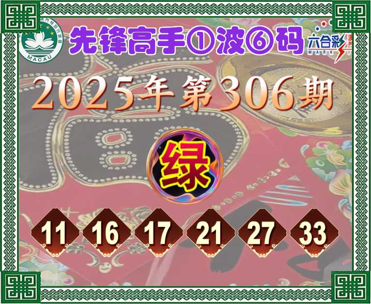 306期:【先锋高手】 ①波⑥码【绿波】开:牛17准